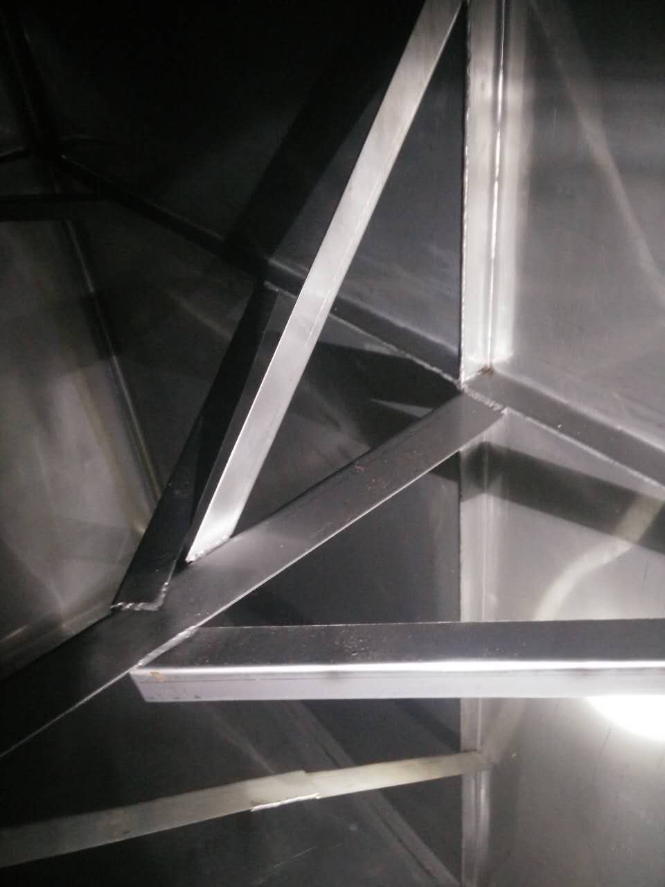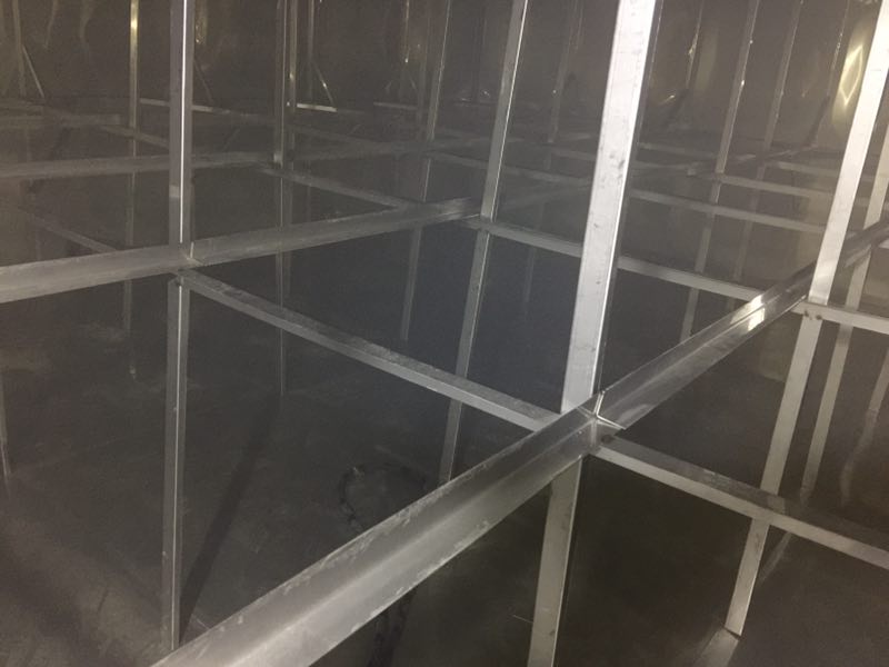 主拉主要作用是防止水箱變形,厚度一般采用靠近底板的側(cè)板厚度為基準,規(guī)格為4cm*4cm。其焊接間距一般為1000mm一條,大型水箱特別是高度超過3米以上的。其間距應該為500mm一條,連接處必須進行滿焊處理。