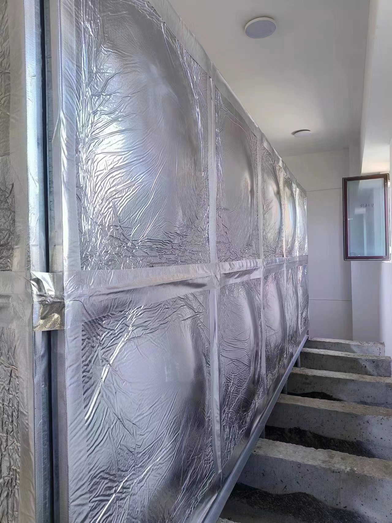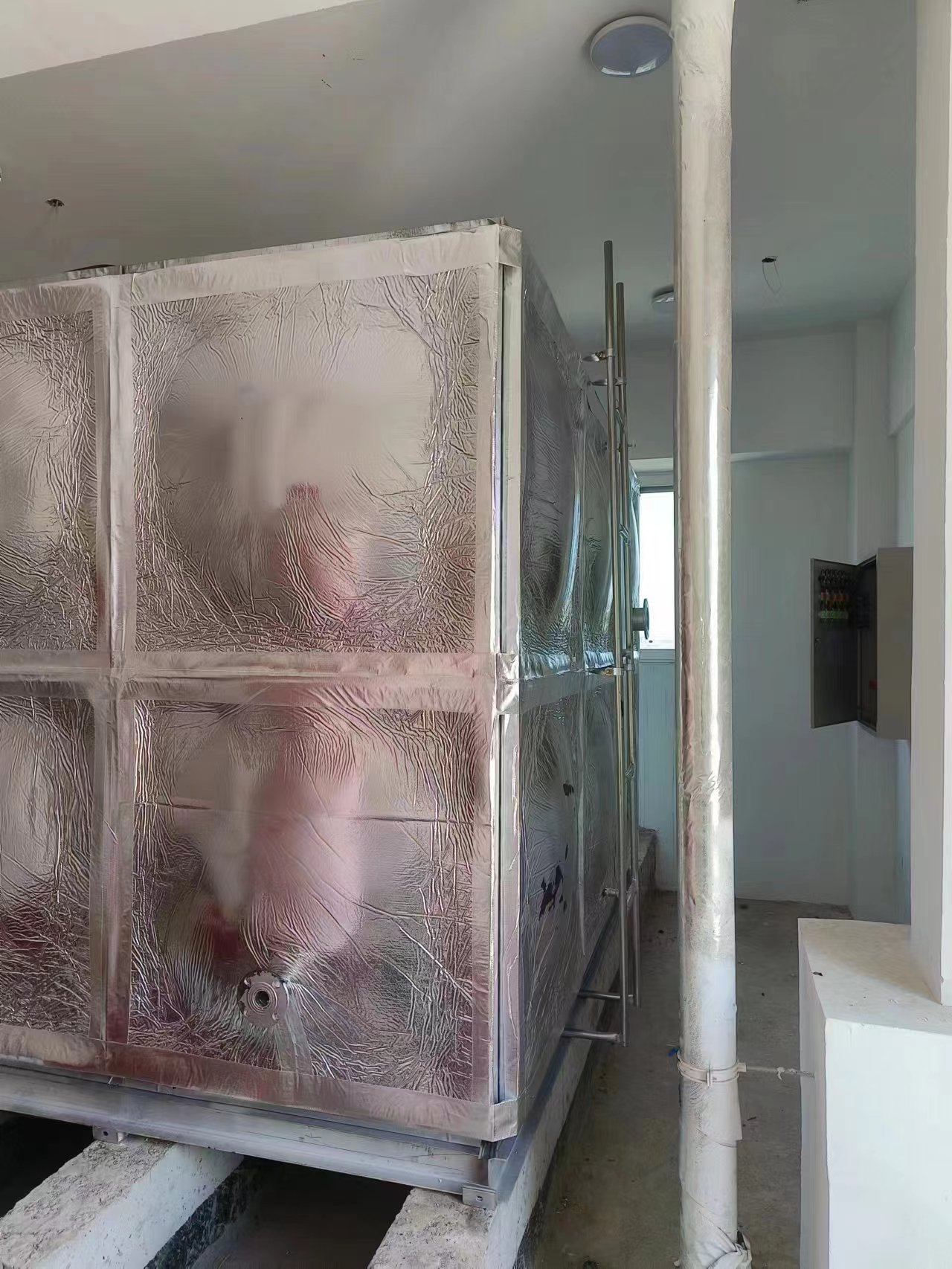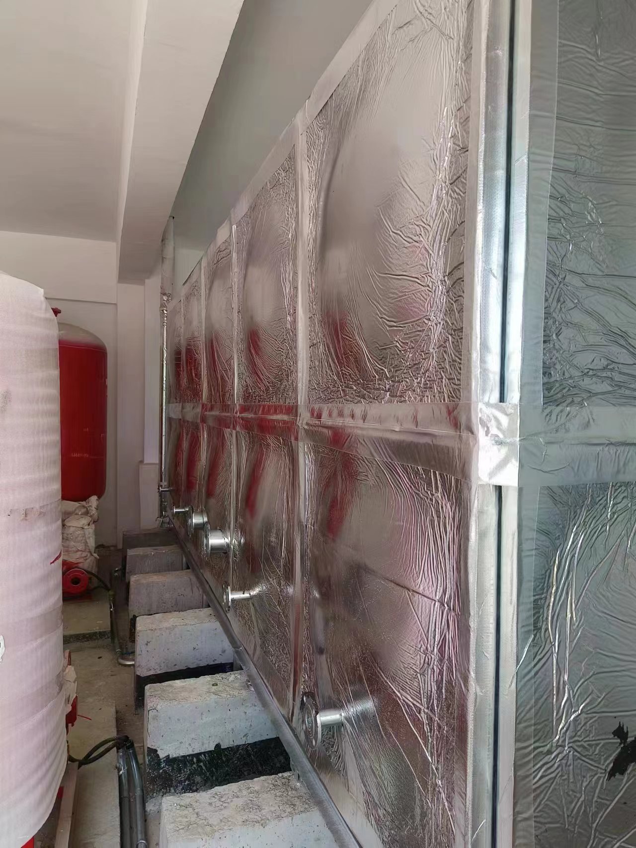 鍍鋅橡塑鋁箔布保溫水箱現(xiàn)場圖:客戶根據(jù)自己實際要求設(shè)置的條形基礎(chǔ),安裝工人到達現(xiàn)場就可以直接焊接槽鋼底座,不耽誤工期。騰翔公司具有專業(yè)的安裝團隊,保障了安裝水箱的質(zhì)量和效率。鍍鋅橡塑鋁箔布保溫水箱是適合用在室內(nèi)的保溫水箱,保溫效果好,價格適中。