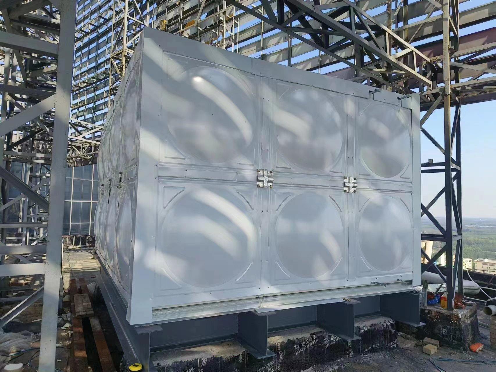 玻璃鋼聚氨酯彩鋼板保溫水箱現(xiàn)場(chǎng)圖:客戶根據(jù)自己實(shí)際要求設(shè)置的條形基礎(chǔ),安裝工人到達(dá)現(xiàn)場(chǎng)就可以直接焊接槽鋼底座,不耽誤工期。騰翔公司具有專業(yè)的安裝團(tuán)隊(duì),保障了安裝水箱的質(zhì)量和效率。玻璃鋼聚氨酯彩鋼板保溫水箱是適合用在室內(nèi)的保溫水箱,保溫效果好,價(jià)格適中。
