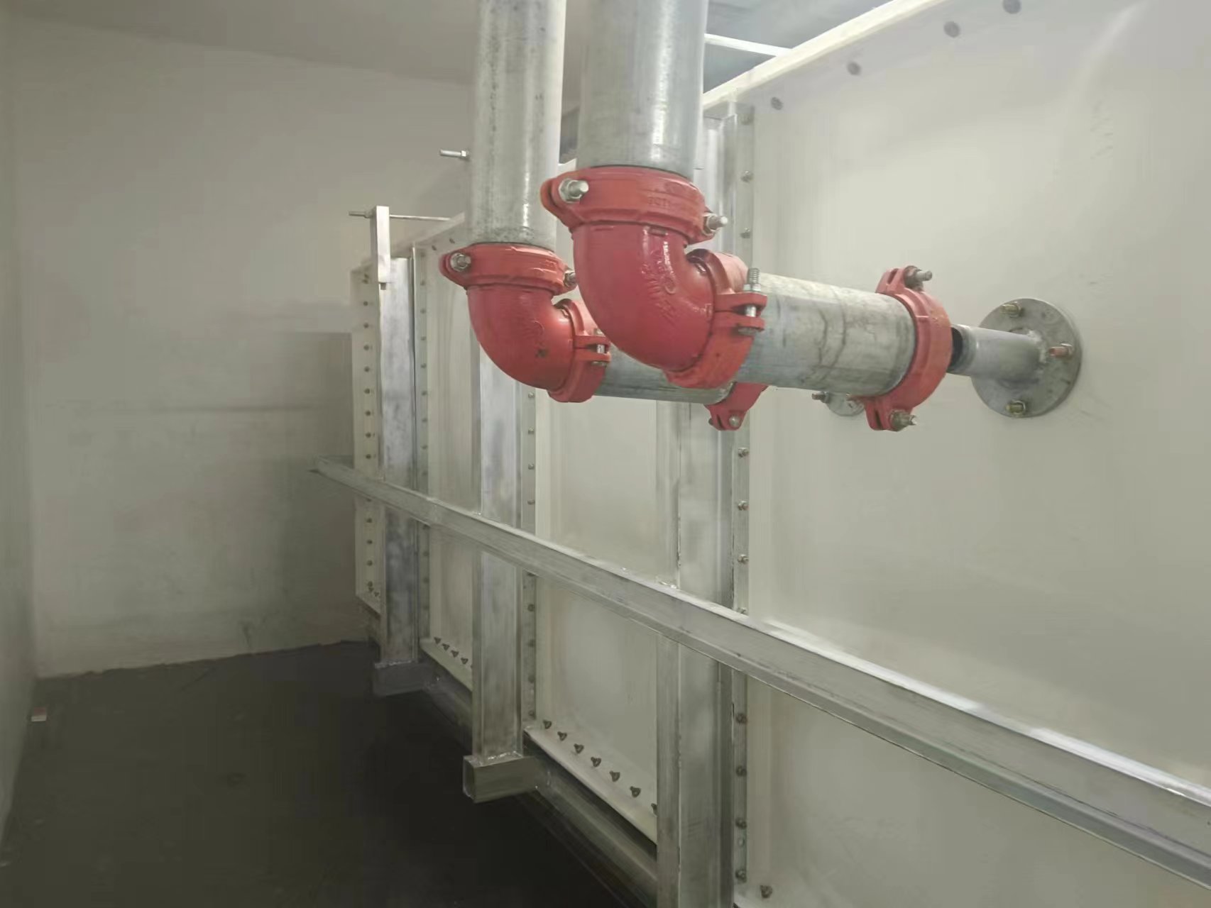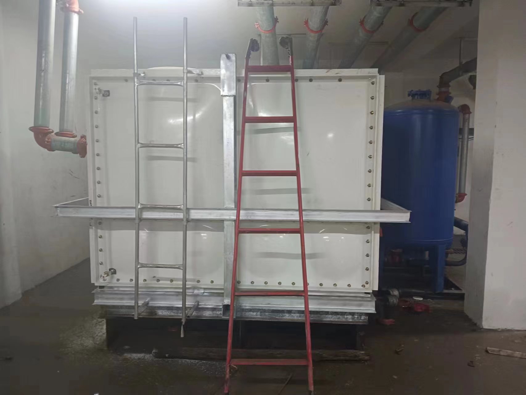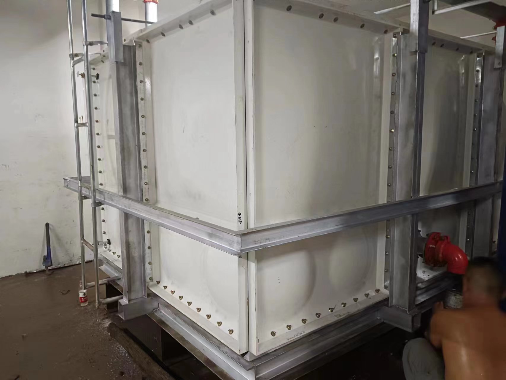 由于使用環(huán)境及使用介質(zhì)所限,有些水箱內(nèi)部盛有高濃度溶液,如:濃鹽水、海水等,對(duì)水箱內(nèi)壁鋼板會(huì)有嚴(yán)重腐蝕,因此無(wú)法采用不銹鋼水箱或者鋼板水箱。正常玻璃鋼水箱板可以耐腐蝕,但是水箱內(nèi)部又設(shè)有鋼制拉筋支撐等,故此也不適用以上介質(zhì)使用。為了滿(mǎn)足特殊用戶(hù)的使用需求,經(jīng)過(guò)承重及承壓測(cè)試后,這種無(wú)內(nèi)件玻璃鋼水箱面世,它采用不同規(guī)格(1000*1000mm、1000*500mm、500*500mm)的玻璃鋼模壓板組裝,水箱內(nèi)部沒(méi)有設(shè)任何鋼制配件,水箱外部及底部采用工字鋼加固,所有法蘭采用ABS材質(zhì)俗稱(chēng)塑料材質(zhì),外觀(guān)整潔無(wú)變形,內(nèi)部無(wú)配件,易清洗、維護(hù)方便,延長(zhǎng)了水箱的使用壽命,滿(mǎn)足特殊用戶(hù)的特殊需求。